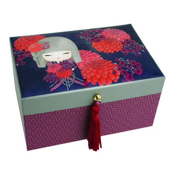 Unikalna szkatułka na biżuterię marki kimmidoll może być prezentem dla bliskiej osoby, bądź dla nas samych. Szkatułka wykonana z ozdobnej tektury, wieczko otwiera się przy pomocy malutkiej gałki z uroczym diamencikiem i ozdobnym frędzlem, wyściełane jest materiałem pokrytym papierem zdobionym laleczką i japońskim wzorem. Wewnątrz szkatułki znajduje się lusterko oraz wyjmowana przegroda na biżuterię.