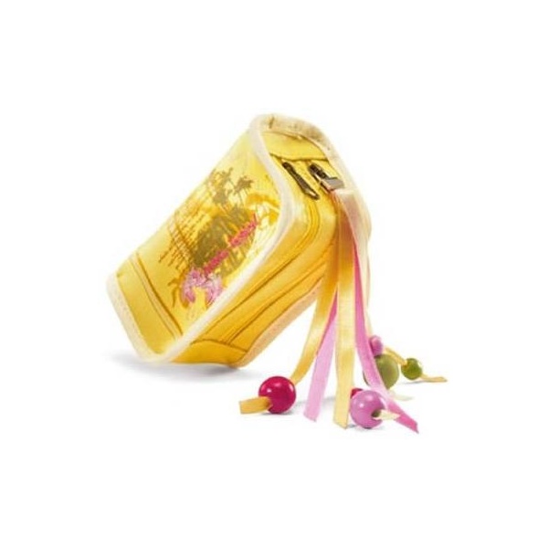 Małe etui na telefon komórkowy lub jako portmonetka. Zgrabny poręczny model. Dodatkowe zapięcie do paska. Kolor różowy i żółty, zamykane na dwa osobne suwaki. Dwie osobne przegródki. Wokół biała aplikacja, wykończone zdobnymi tasiemkami i koralikami.